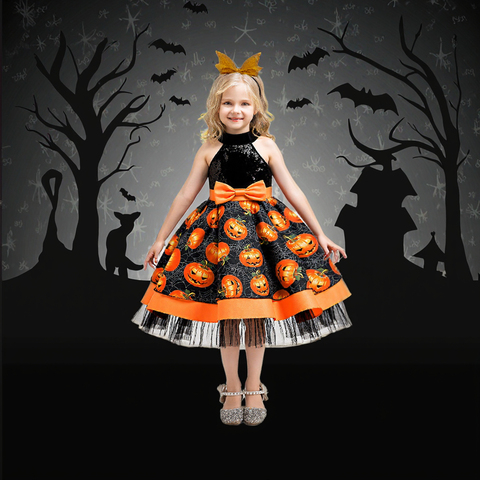 Nuevo vestido de Halloween para niñas, falda estampada con lentejuelas, vestido de encaje satinado, vestido de fiesta para niños, traje al por mayor